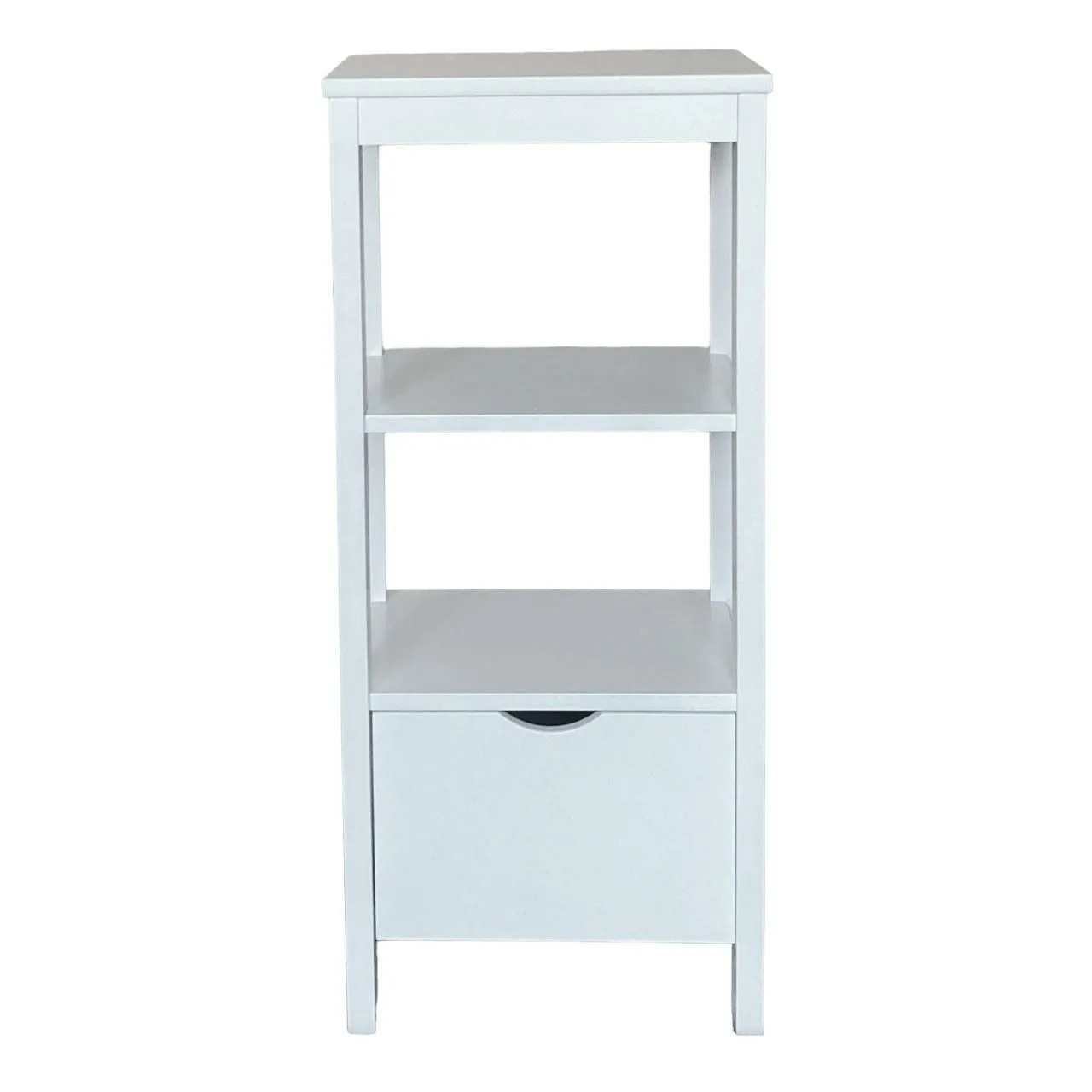 Este mueble de baño está equipado con un cajón bajo y tres estantes (dos compartimentos) para guardar objetos de baño como toallas, papel higiénico y otros artículos de tocador. Los materiales utilizados para su fabricación son de "madera de pino natural", lo que le brinda una calidad y belleza únicas. Además, el "color blanco nieve" del mueble le da un aspecto moderno y elegante, a la vez que se adapta perfectamente a la decoración del baño.