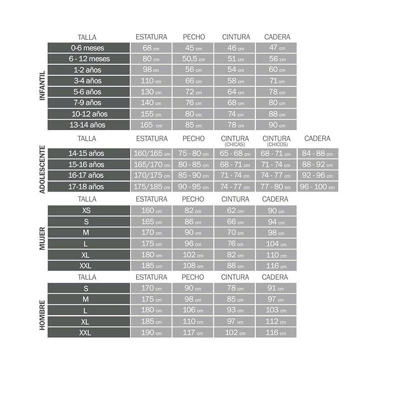 • Las siguientes medidas se corresponden con la dimensión aproximada de la prenda.