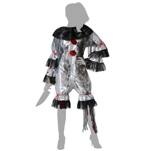 DISFRAZ PAYASA MACABRA GRIS, MUJER ADULTO PARA HALLOWEEN CARNAVAL TEATRO