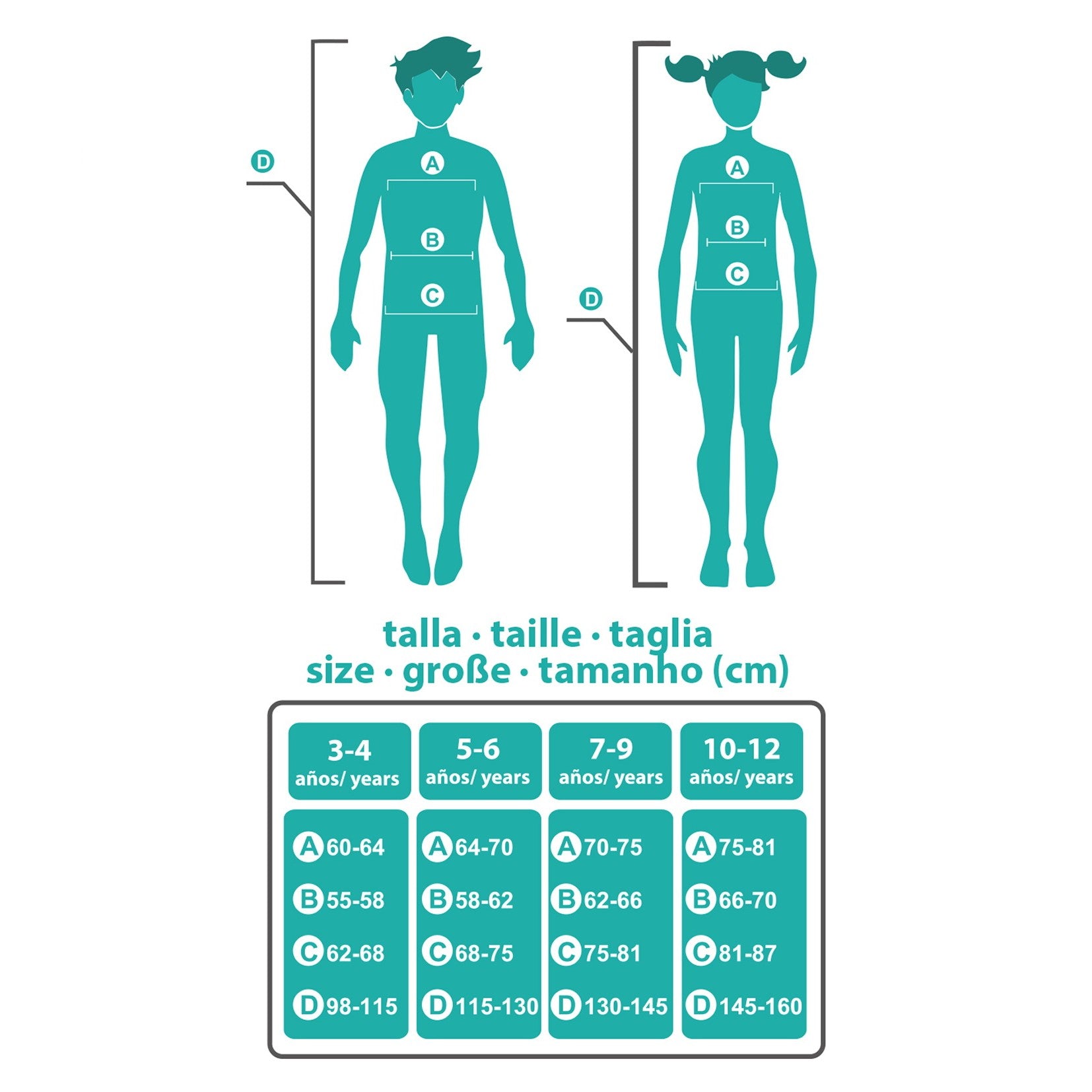 • Guía de tallas: 2-4 años (Altura: 100 cm, Pecho: 56 cm, Cintura: 53 cm, Cadera 59 cm) // 4-6 años (Altura: 114 cm, Pecho: 61 cm, Cintura: 57 cm, Cadera 65 cm) // 7-9 años (Altura: 135 cm, Pecho: 70 cm, Cintura: 62 cm, Cadera 74 cm) // 10-12 años (Altura: 150 cm, Pecho: 75 cm, Cintura: 65 cm, Cadera 80 cm)