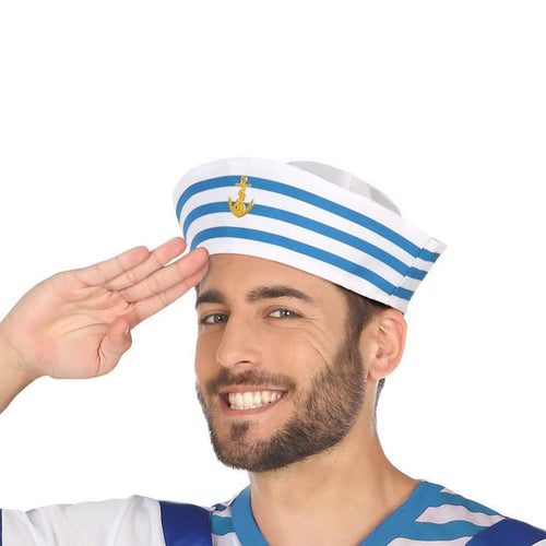 Gorro De Marinero a Rayas Azules y Blancas Con Ancla Dorada Accesorios De Carnaval