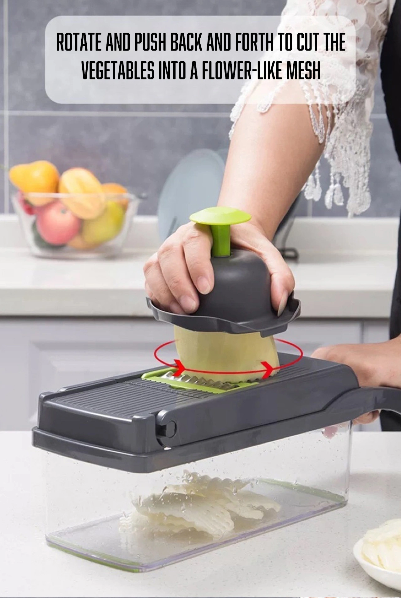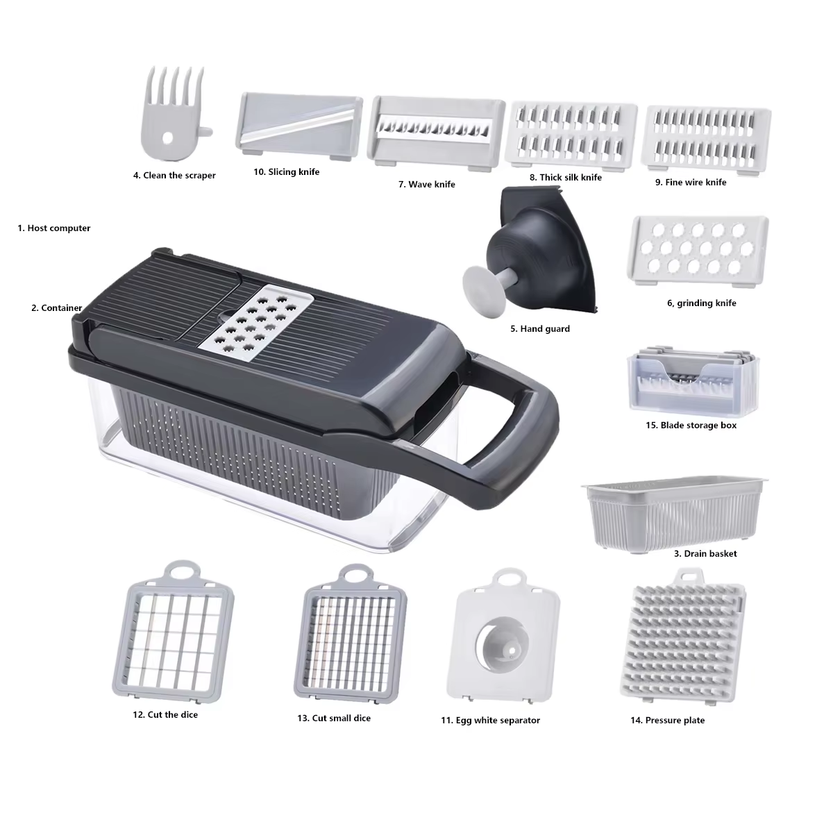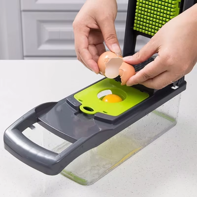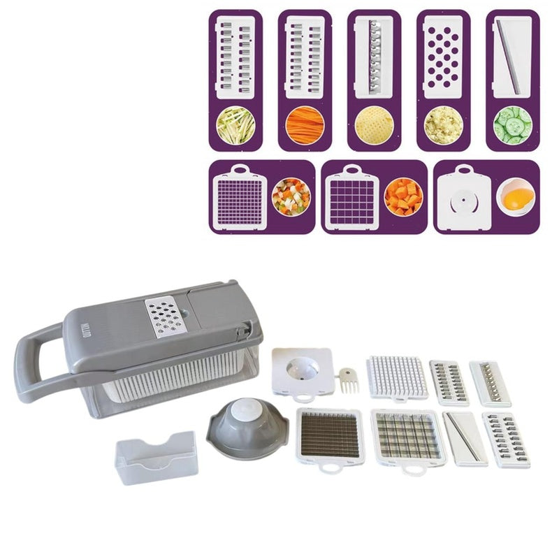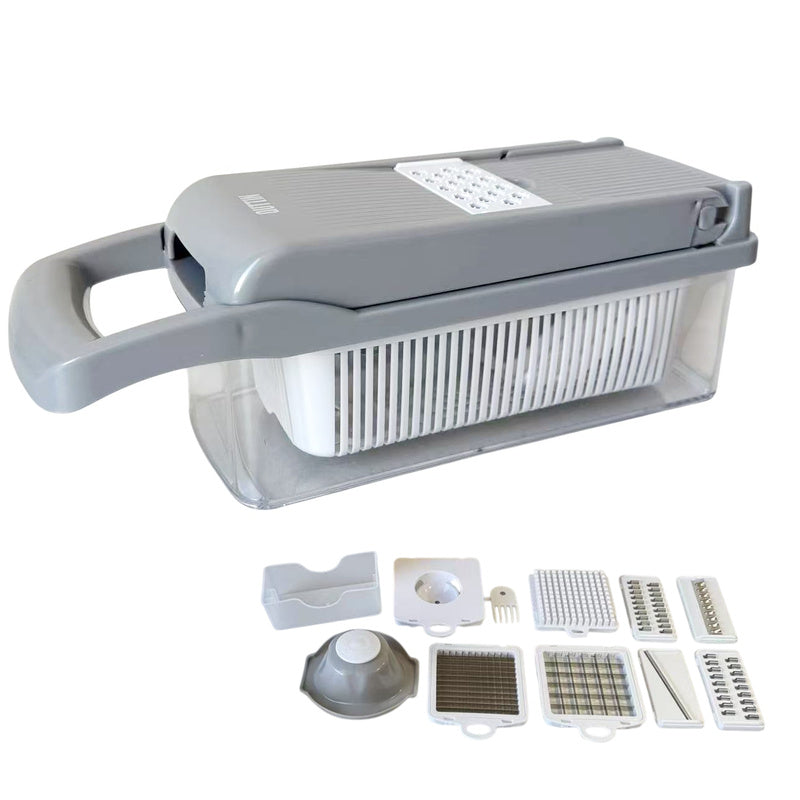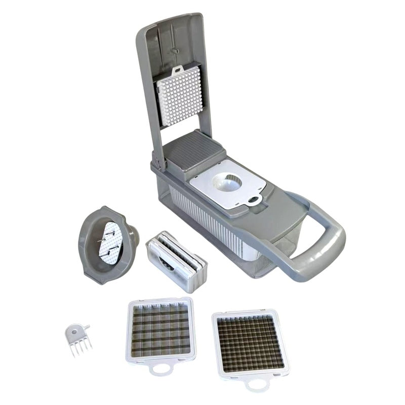Cortador Rallador Multifunción Deposito con 5 Múltiples Intercambiables para rallar o Rebenar + 2 Cuchillas Corte a Dados, Mandoa de Cocina