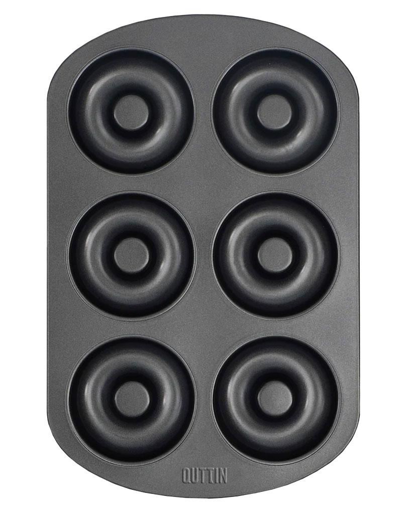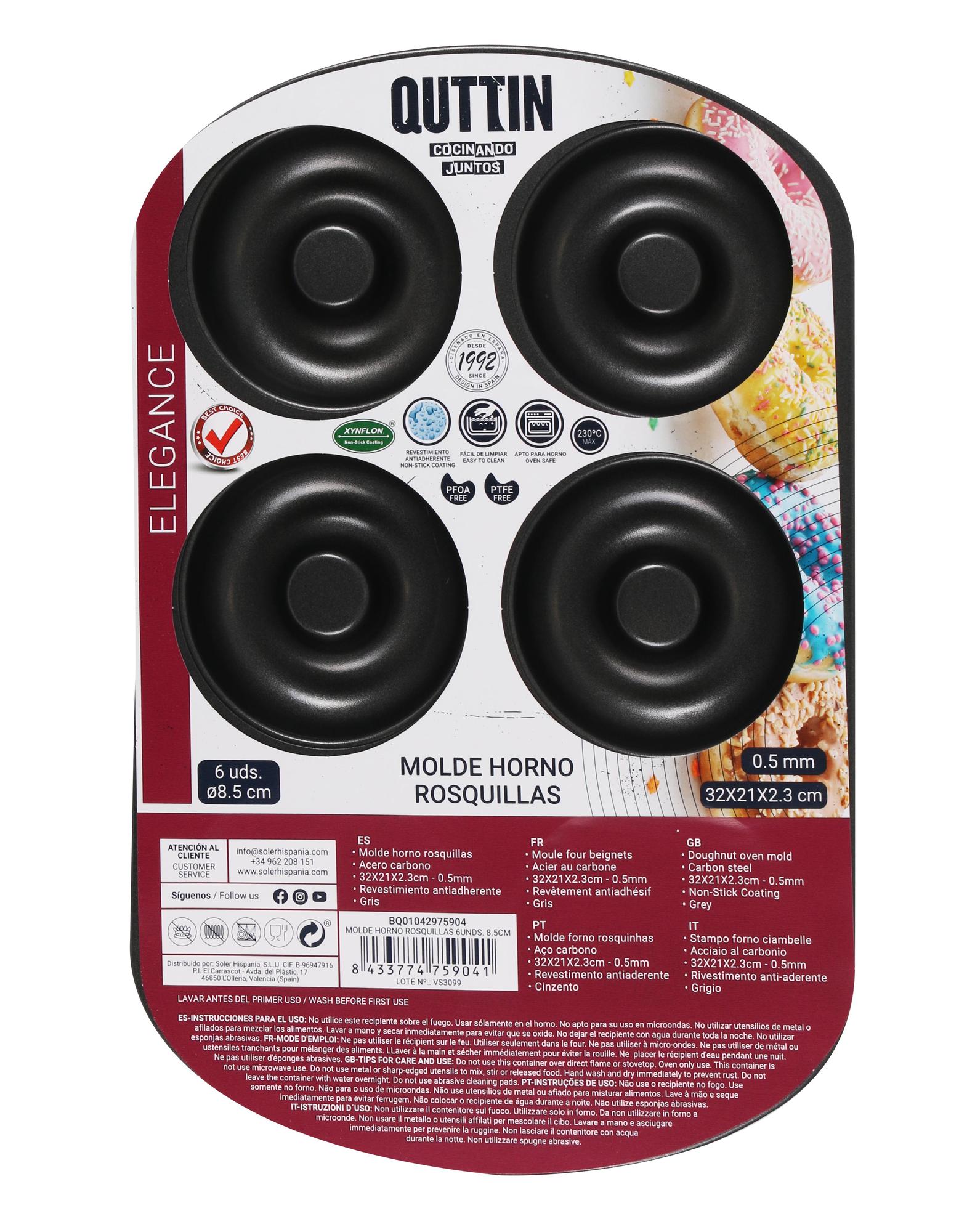 Disfruta horneando rosquillas caseras con este molde Quttin de 6 cavidades. Fabricado en acero carbón resistente, cuenta con revestimiento antiadherente que evita que las masas se peguen, facilitando el desmoldeo y la limpieza.