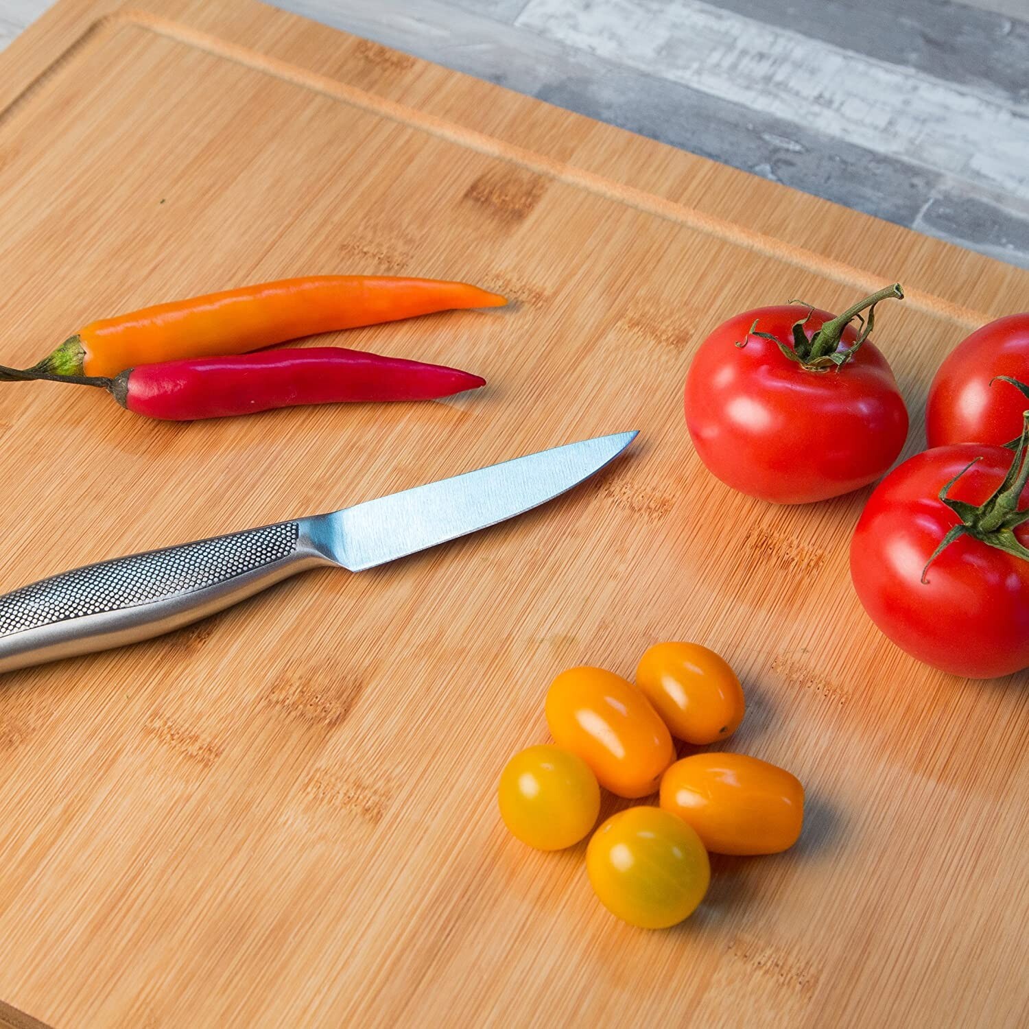 • Contenido del envío: 1 tabla de cortar de bambú con protección en los bordes.