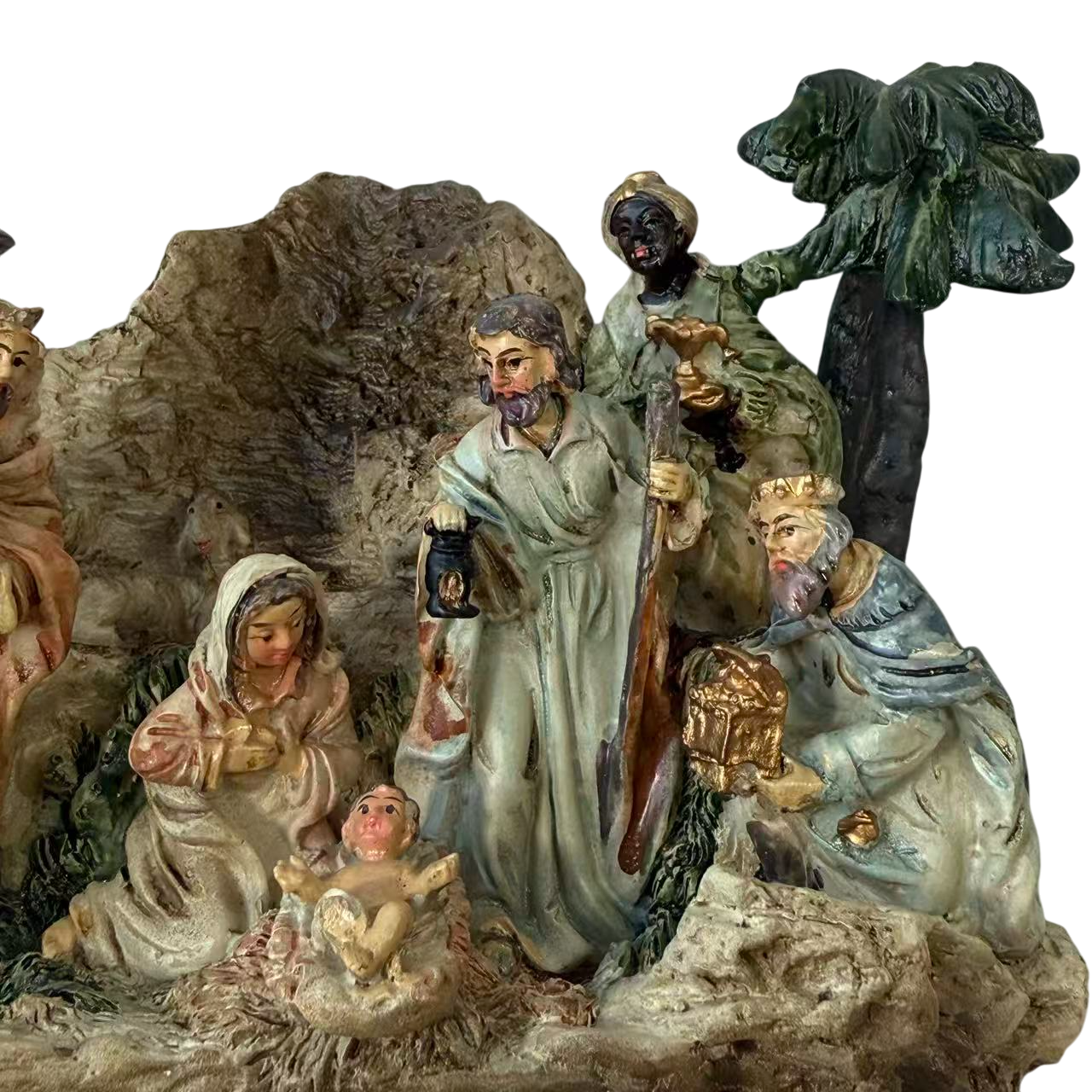 Escena de Navidad con figuras de nacimiento elaborada en resina. Representa el portal con la Sagrada Familia, los Reyes Magos y otros personajes, con detalles pintados a mano y un acabado realista.