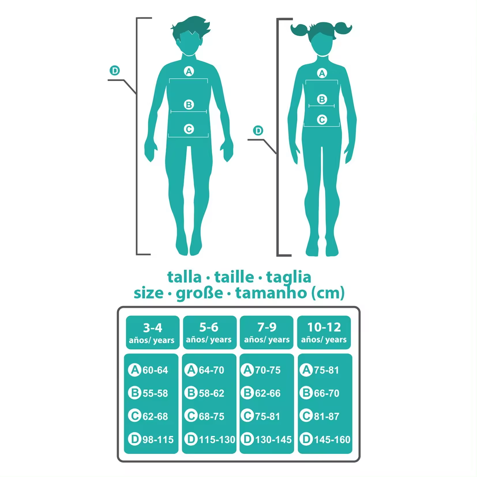 • Guía de tallas infantil: 3-4 años (Altura: 100 cm, Pecho: 56 cm, Cintura: 53 cm, Cadera 59 cm) // 4-6 años (Altura: 114 cm, Pecho: 61 cm, Cintura: 57 cm, Cadera 65 cm) // 7-9 años (Altura: 135 cm, Pecho: 70 cm, Cintura: 62 cm, Cadera 74 cm) // 10-12 años (Altura: 150 cm, Pecho: 75 cm, Cintura: 65 cm, Cadera 80 cm)