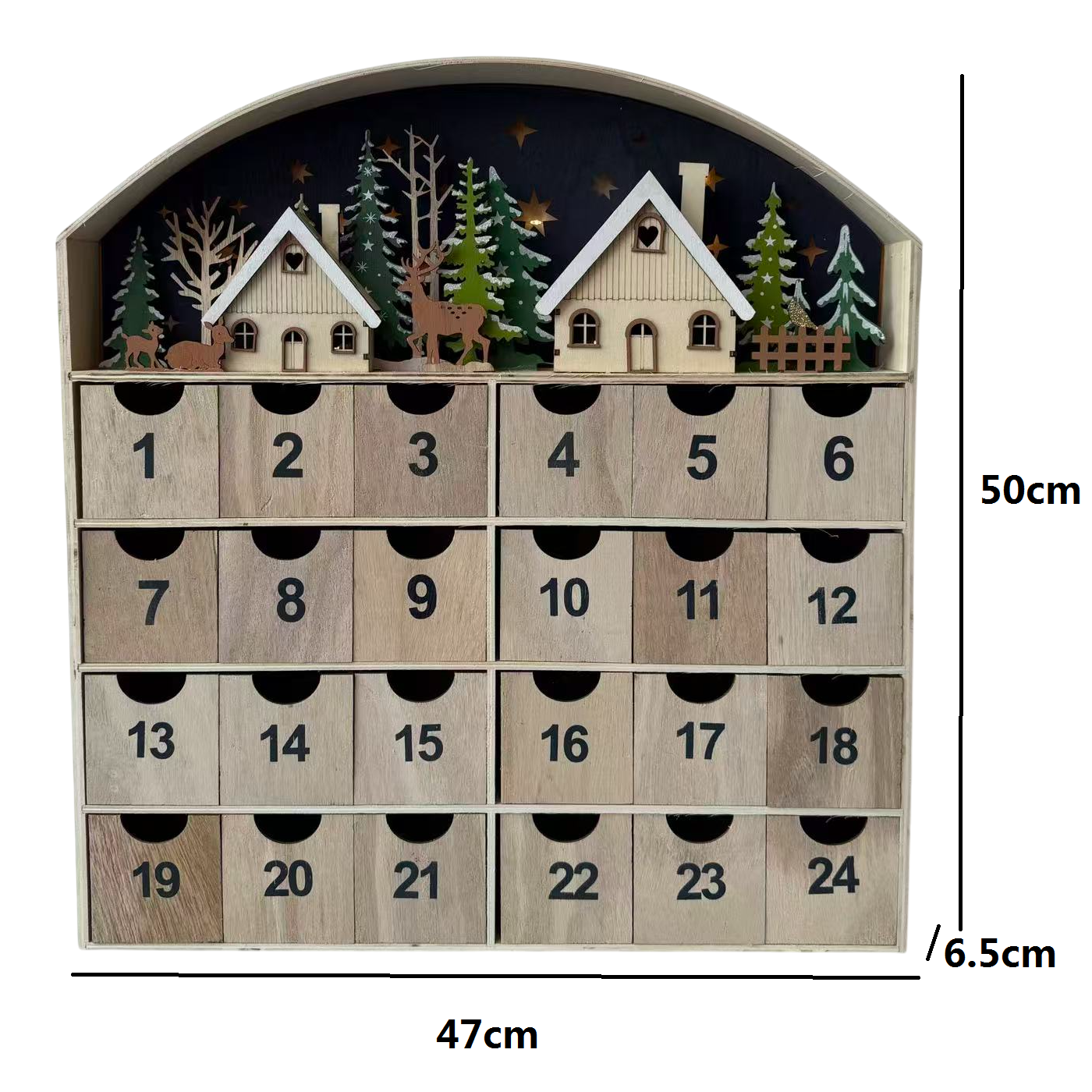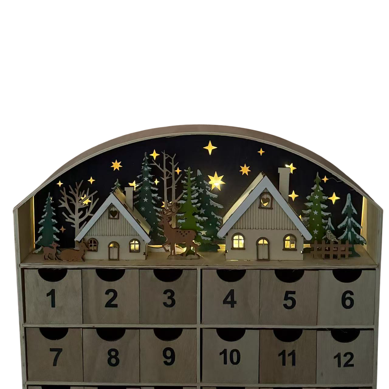 Calendario de adviento fabricado en madera natural, con 24 cajones numerados para guardar sorpresas, dulces o pequeños regalos. La parte superior presenta una escena navideña decorativa con casitas, abetos nevados y ciervos en un bosque iluminado con luces LED cálidas que aportan un ambiente acogedor.