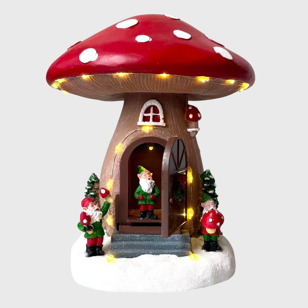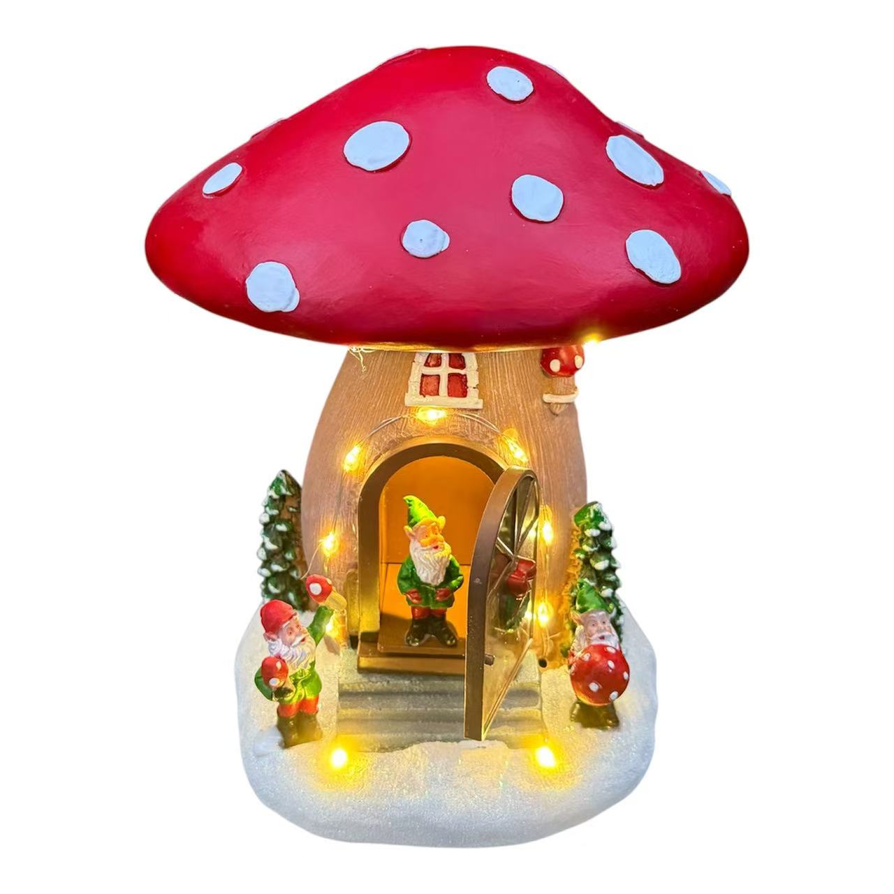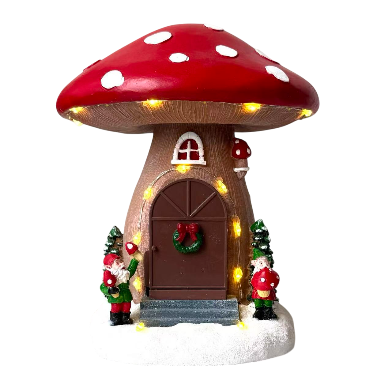 • Diseño Único: Casa con forma de seta roja con detalles nevados, adornada con pequeños duendes y árboles.