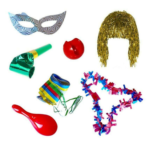 6 paquetes Cotillon fin año nochevieja completo peluca luz antifaz matasuegras