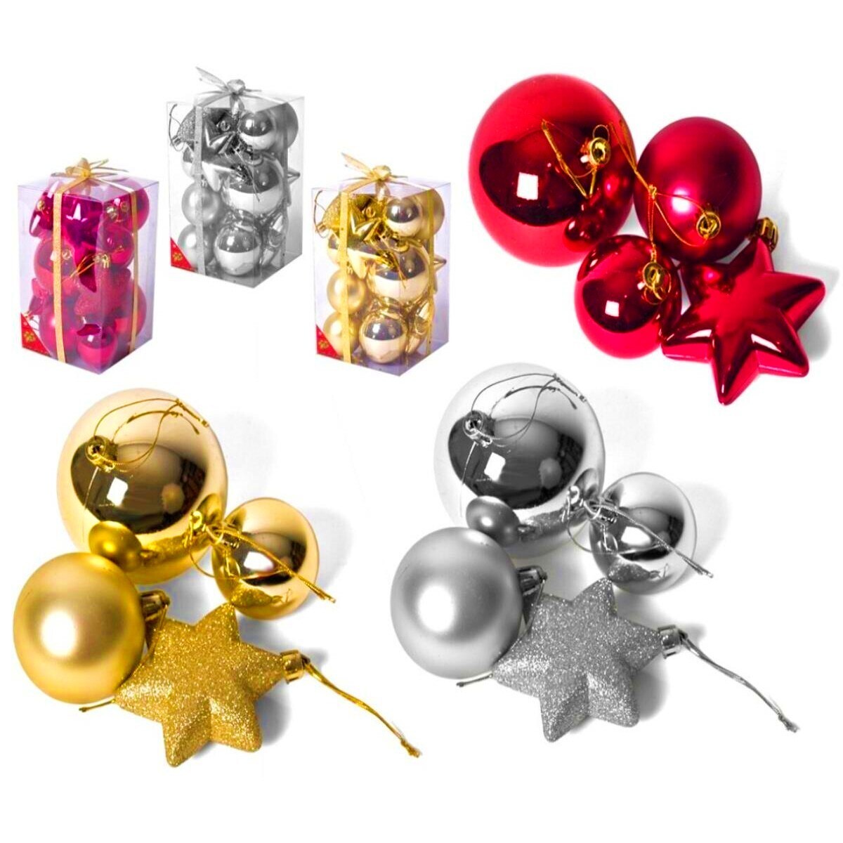 Colgante de Bolas Estrellas de Navidad x15 Piezas 4 surtido Bolas Estrellas Brillantes Mates Purpurina.