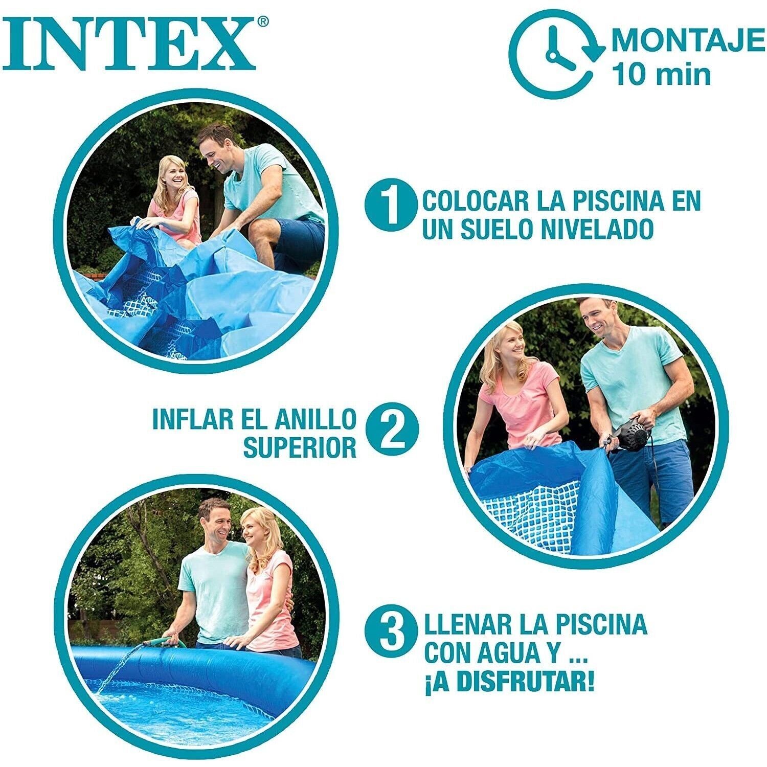 Las piscinas hinchables Easy Set de INTEX se caracterizan por su fácil montaje e instalación, diseñadas como una única pieza, por lo que no necesitan de estructuras rígidas para mantener su forma.