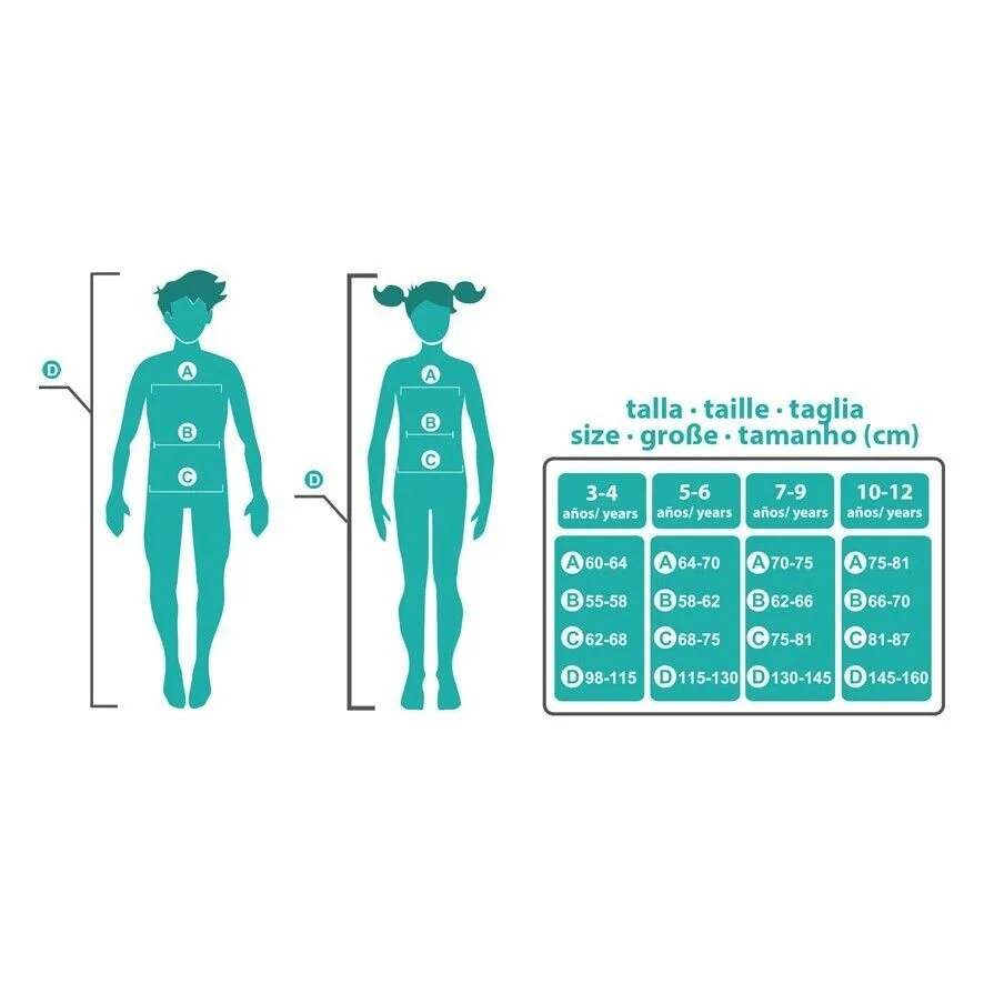 3-4 Años: contorno de pecho: 55-58 cm, de cintura: 70-80 cm, de cadera: 62-68 cm, altura: 98-115 cm